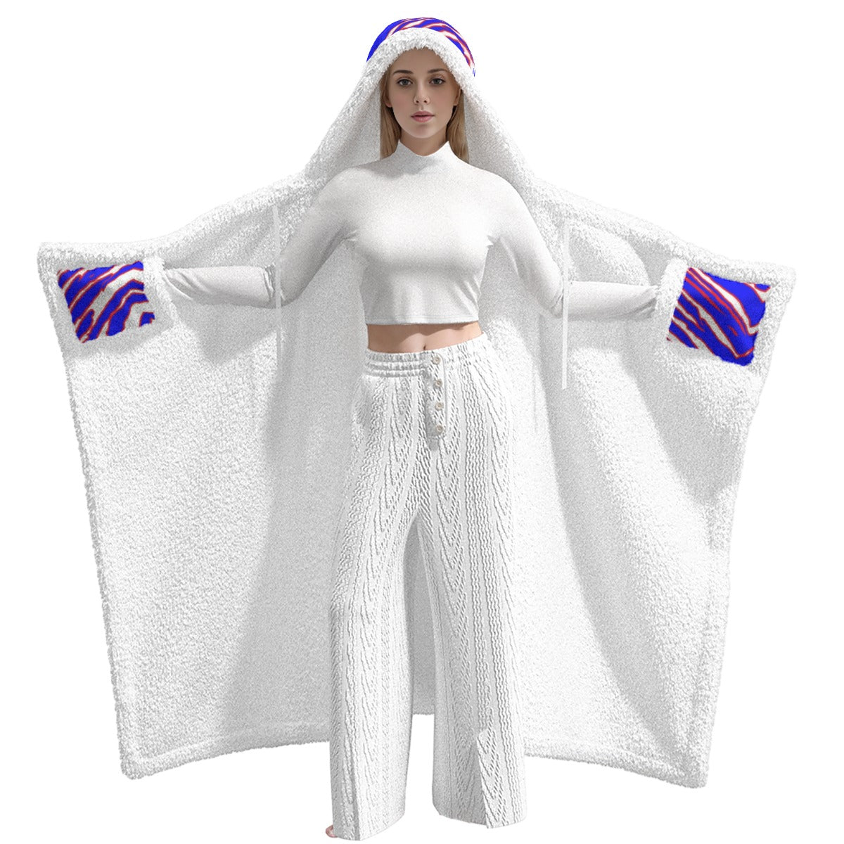 All-Over Print Unisex Wearable Hooded Blanket – Red Blue White Zebra Game Day Style