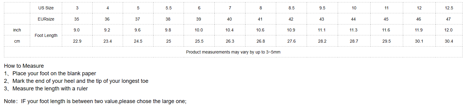 | EUR Size | US Size | Insole Length(inch) | Insole Length(mm) |