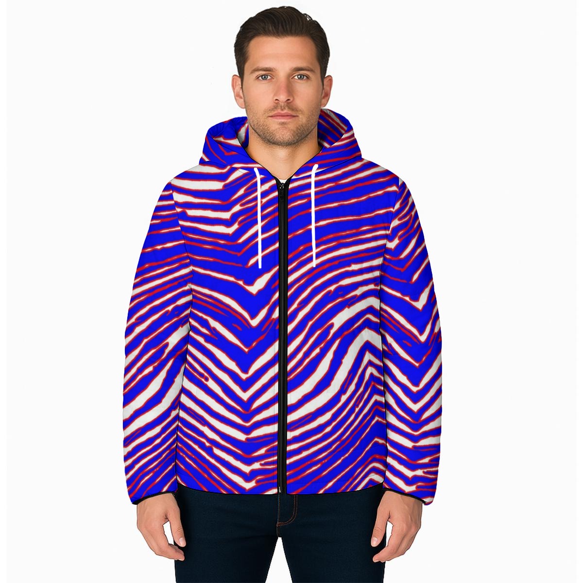 Inspired by iconic zebra football patterns, this hooded jacket adds instant personality to any outfit. The warm insulated construction provides reliable protection against cold weather, while the adjustable hood and relaxed unisex fit ensure comfort for both men and women.