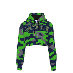 Seattle Seahawks Varsity Camo Women’s Crop Top Hoodie – Navy and Action Green Game Day Cropped Sweatshirt