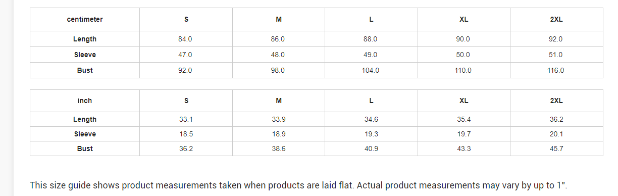 | centimeter | S | M | L | XL | 2XL |